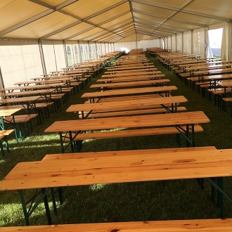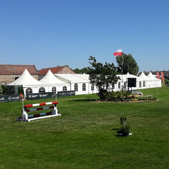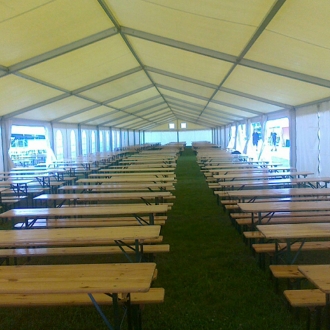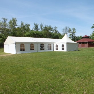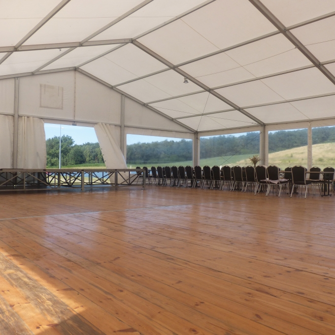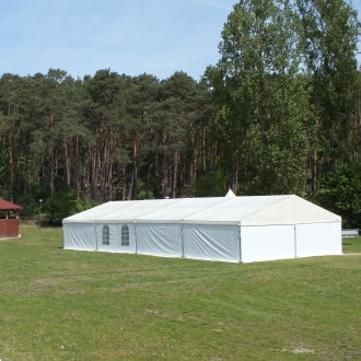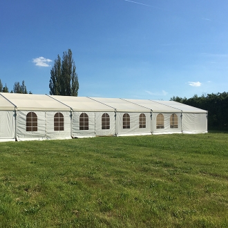 Hala namiotowa modułowa o szerokości 10 metrów, natomiast jej długość może być dowolna 5m, 10m, 15m, 20m, 25m, itd. Halę można ustawić z podłogą lub bez. Profesjonalna podłoga na stelażu z włoskiej sklejki, którą można wynająć osobno do 100-300m2. Dysponujemy kompleksowym wyposażeniem dodatkowym.