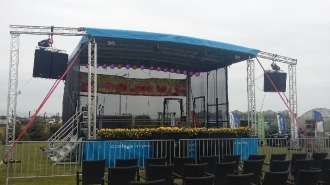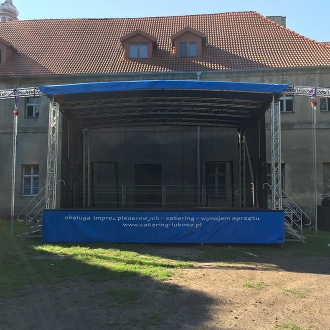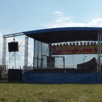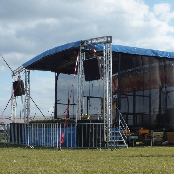 Mobilna scena o wymiarach 7,6 x 6 x 5,1m z dachem łukowym profilowanym, produkcji firmy ALSPAW, posiadająca wszelkie atesty krajowe i zagraniczne dla tego typu urządzeń.Scena ze względu na krótki czas montażu może być użyta w kilku miejscach w ciągu doby.