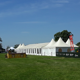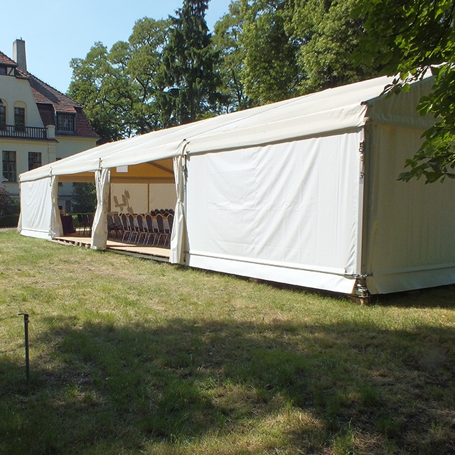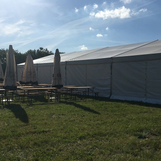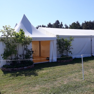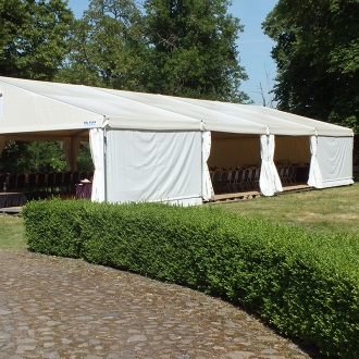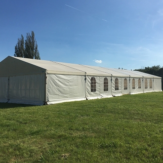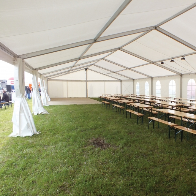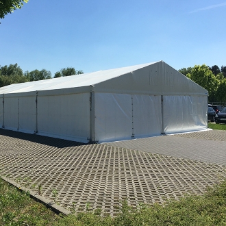 Hala namiotowa modułowa o szerokości 10 metrów, natomiast jej długość może być dowolna 5m, 10m, 15m, 20m, 25m, itd. Halę można ustawić z podłogą lub bez. Profesjonalna podłoga na stelażu z włoskiej sklejki, którą można wynająć osobno do 100-300m2. Dysponujemy kompleksowym wyposażeniem dodatkowym.