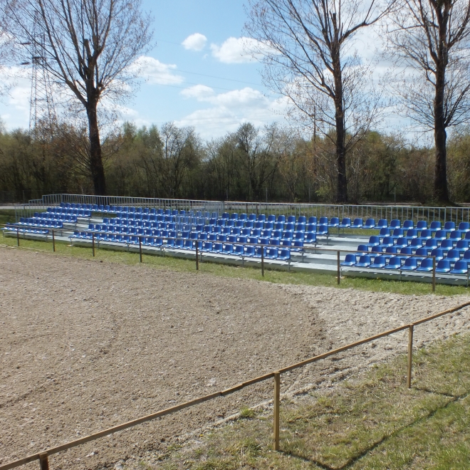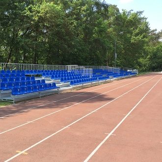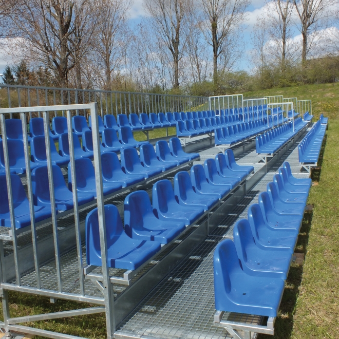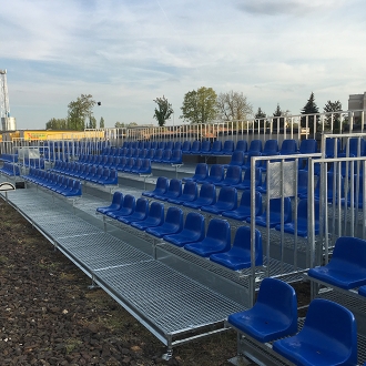 Trybuna 5-rzędowa, konstrukcja w ocynku ogniowym, podesty z kraty VEMA. Trybuna demontowalna, wykonana wg systemu firmy Prostar. Na trybunie zamontowano siedziska wandaloodporne WO-06 (wys. oparcia 32,5 cm). Jedna trybuna posiada 104 miejsca siedzące