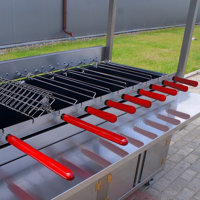 Grill weglowy z 2 rusztami do grilowania 12 szpikulcy z silnikami obrotowymi wykonany ze stali nierdzewnej, regulowanay ruszt