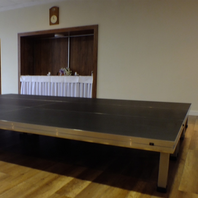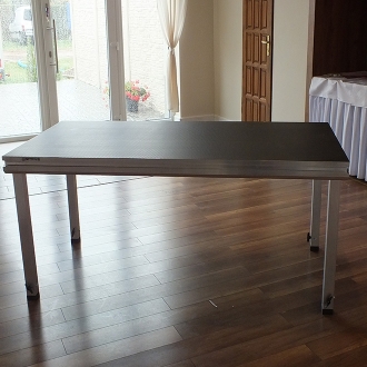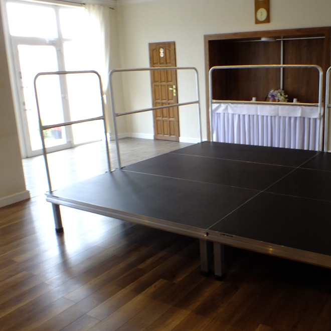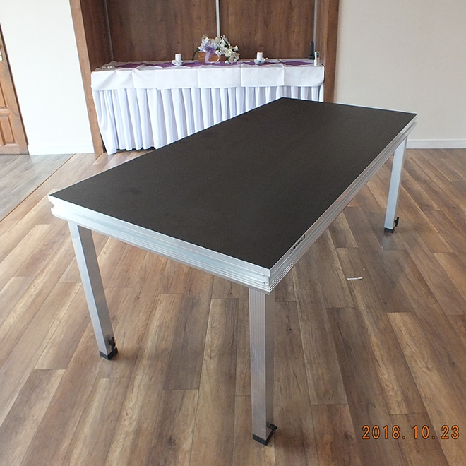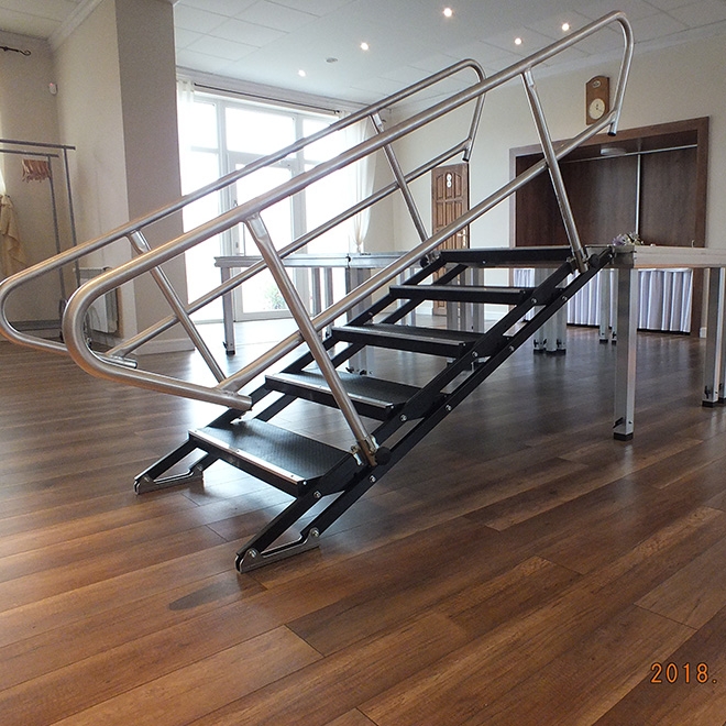 Moduły o wymiarach 1 x 2m, nogi regulowane od 80 cm do 140, drugi komplet nóg bez regulacji o wymiarach 40 cm, barierki, schody samopoziomujące do wysokości 140 cm.