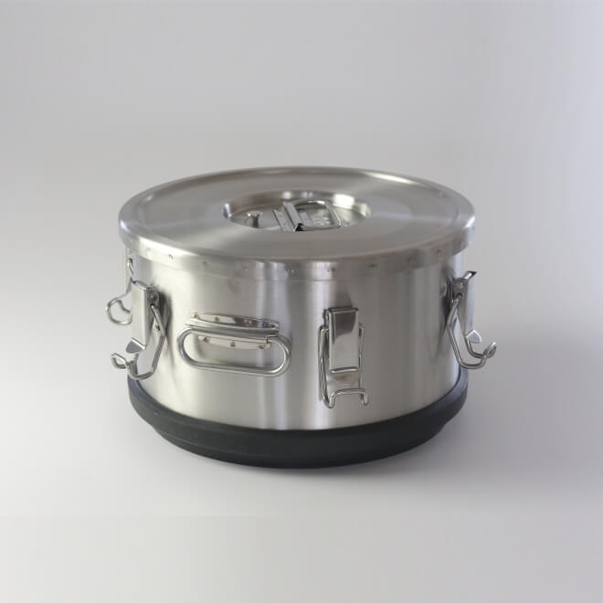 Termos do transportu żywności z pokrywą zawierającą silikonową uszczelkę, wyposażony w 6 zatrzasków i wentyl odpowietrzający eliminujący podciśnienie, podstawa wykonana z elastycznego tworzywa